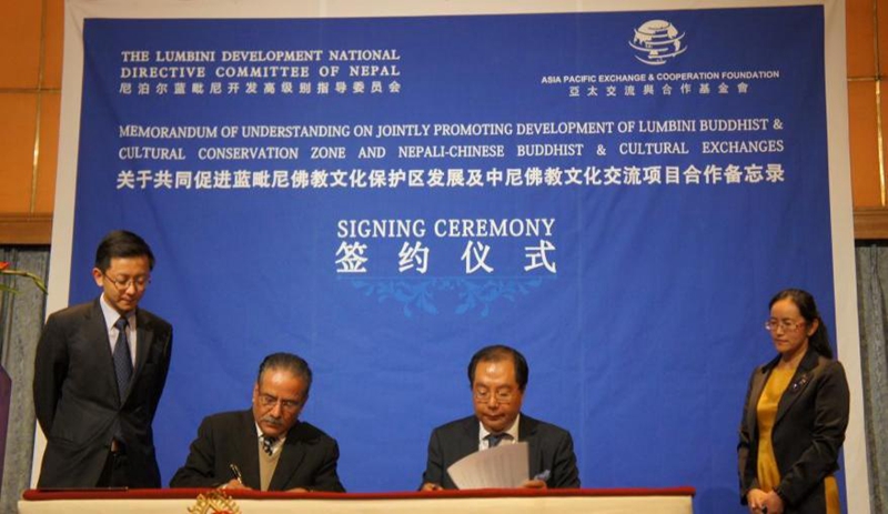 亚太交流与合作基金会与尼泊尔有着长期合作与交流的渊源,同尼泊尔不同政党及各届政府都保持着密切合作。特别是2010年发起的“蓝毗尼佛教文化特区”项目,产生了深远性的影响,使沉静多年的蓝毗尼焕发“青春”,全球近百家主流媒体予以广泛报道,成为当时世界的热点和焦点。亚太交流与合作基金会于2011年5月与尼泊尔旅游民航部签订了框架协议,就尼泊尔如何打造基础设施方面达成共识;次年2012年11月,与蓝毗尼开发高级别委员会签署了《共同促进蓝毗尼佛教文化保护区建设和中尼佛教文化交流项目合作备忘录》,把佛陀诞生地文化遗产保护和有限开发结合起来,打造成世界佛教圣地。经过十多年的努力,亚太交流与合作基金会在尼泊尔所推动的基础设施建设项目已完成大部分。经过此次会面,双方认为当初计划在蓝毗尼建立的佛塔项目是推动世界文明复兴与世界和平的象征,双方将加大力度予以推进。