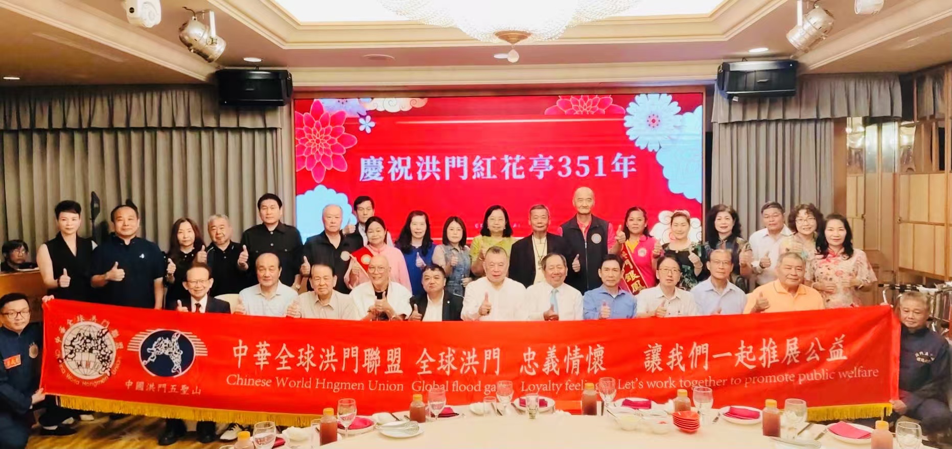 劉會進表示:「適逢紅花亭351年生日,洪門龍兄虎弟金姐銀妹及支持洪門貴賓相聚一堂,其樂融融。會場設有洪門忠義堂由洪門執事團隊隊長陳文虎領軍執事進行儀式祭拜洪門始祖、五祖追思禮拜。