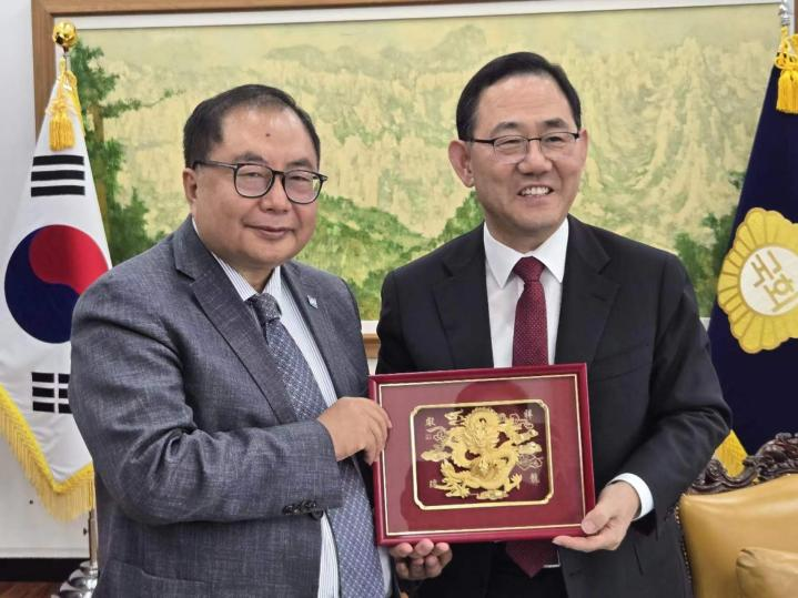 韩国执政党副议长朱豪英(右)与肖武男执行副主席合影