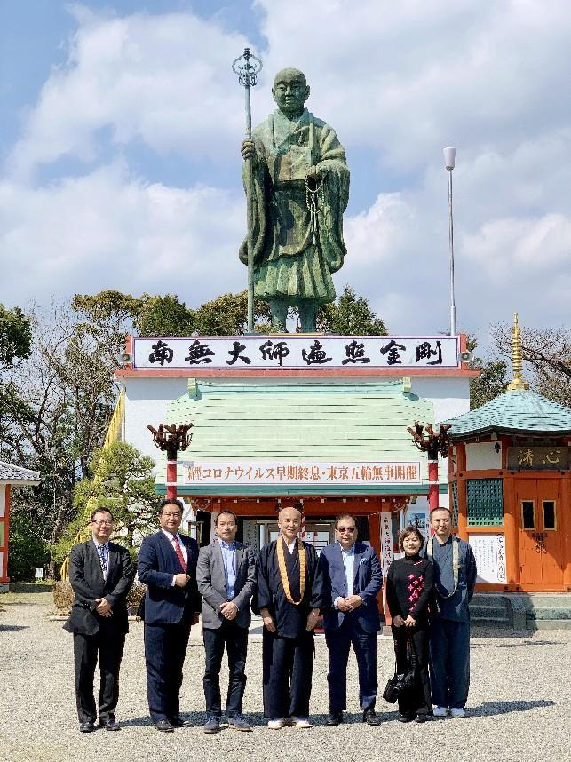 宫崎今山大师寺方丈野中玄雄(中)主持了中日两国抗疫佛教法会,日本参议员松下新平先生(左二)与肖武男执行副主席(右三)出席