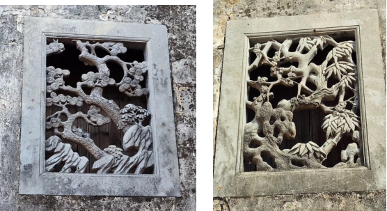 徘徊在西园中院,目光被墙上精美的石雕漏窗吸引,左为松石图,右为竹梅图,堪称“徽州三雕”中之精品。
