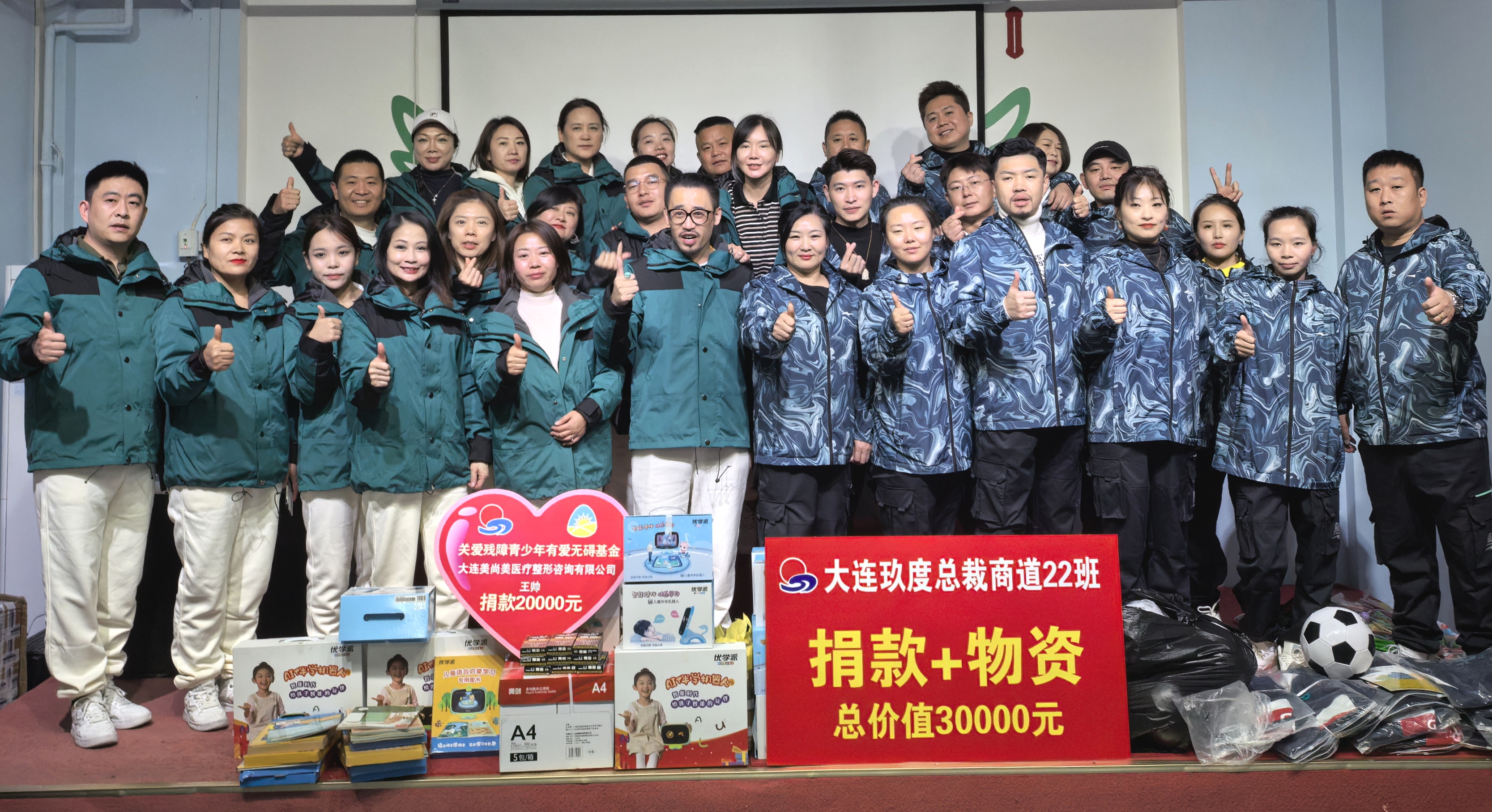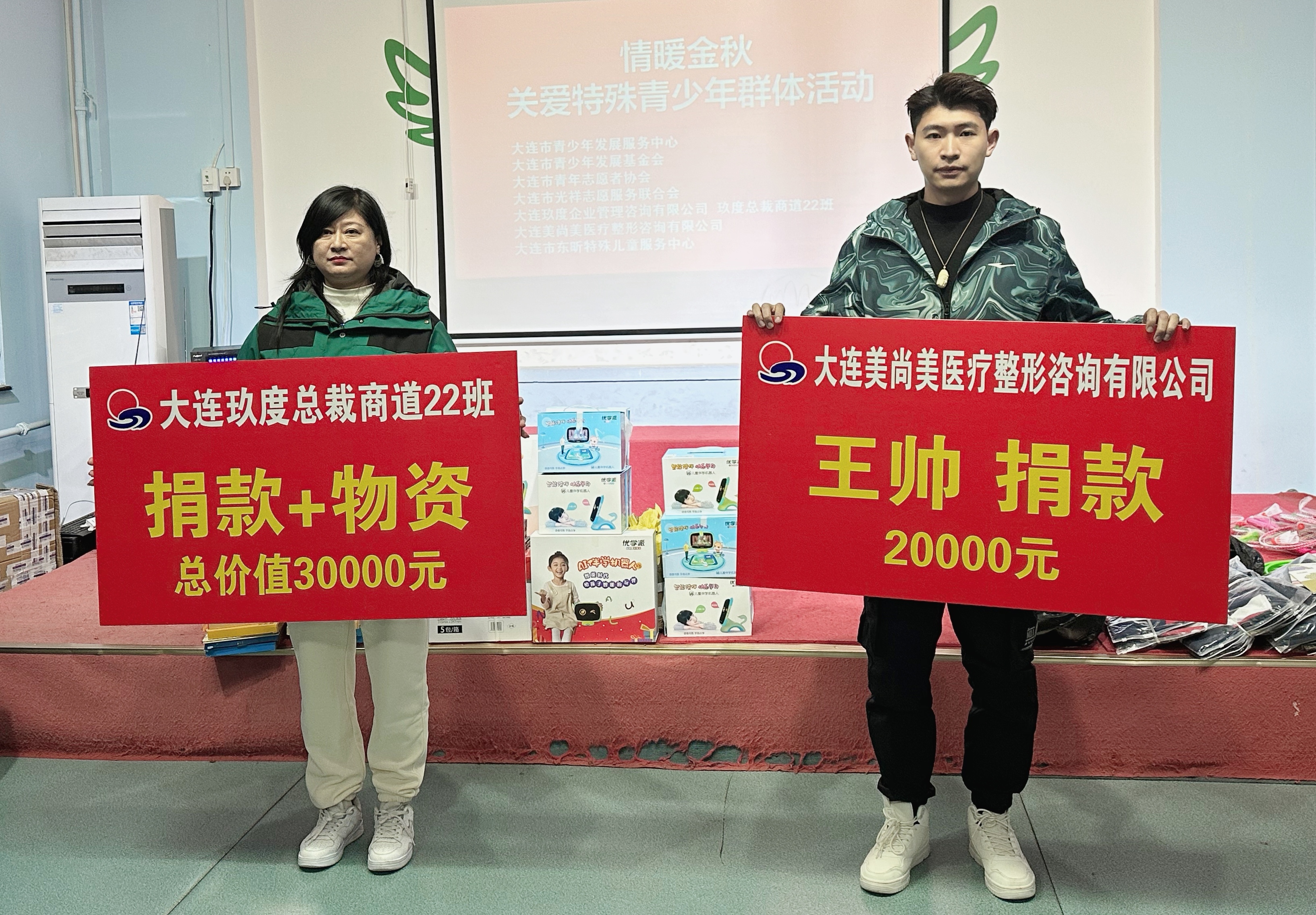 欧亚通讯社电(记者耿玲)10月22日下午,大连市青年志愿者协会、光祥志愿服务联合会携手大连玖度总裁商道22班和23班的30多位爱心志愿者们,冒雨来到大连市东昕特殊儿童服务中心,举行“情暖金秋〞关爱特殊青少年群体活动,将爱传递,当场捐款赠物5万元。其中,大连玖度总裁商道爱心志愿者、大连美尚美医疗整形咨询有限公司王帅捐款2万元,专门用于特殊青少年手术费用。
