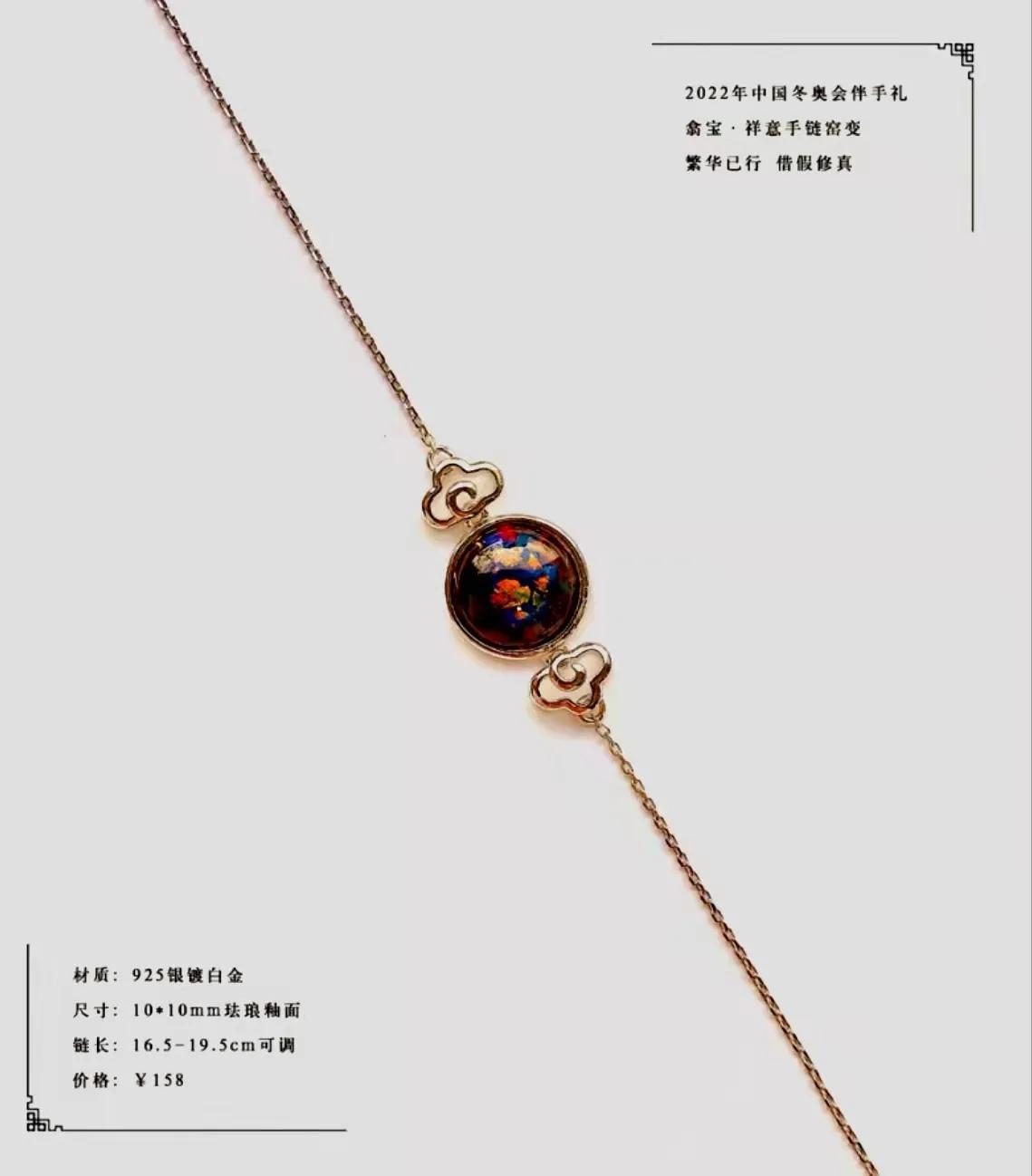 憨宝们制作的这些2022年北京冬奥会、冬残奥会伴手礼,其名字叫翕宝·祥意系列,包括手链、项链等,其设计意蕴悠长,采用10*10mm尺寸圆形翕宝釉面,小巧精致,再加上别致的祥云点缀,中国元素满满。
