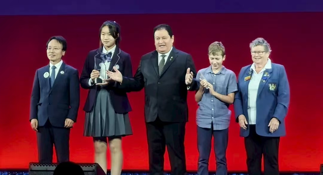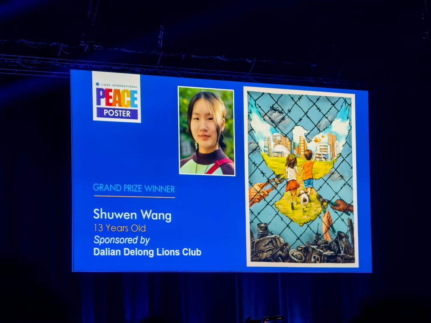 开幕会上,国际狮子会总会长奥利维拉向世界和平海报唯一全球总冠军——来自中国狮子联会大连代表处选送、大连海滨美术学校的王姝雯同学颁发了奖牌。这是中国少年儿童第七次摘得此冠,也是来自大连的少年儿童作者荣获的第五个世界和平海报大赛全球总冠军。当中国狮子联会德隆服务队狮友、大连海滨美术学校校长朱海滨和王姝雯同学走上舞台时,全场高声欢呼、热烈鼓掌,致以由衷的祝贺。