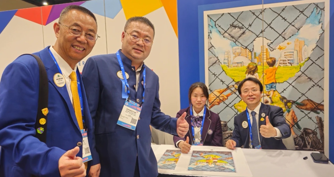 大连的13岁女生王姝雯的作品《和平无止境》通过象征手法展现了人类对和平的向往,以剪断铁丝网的意象表达破除隔阂、共创美好未来的深刻寓意。奥利维拉总会长表示,这幅作品展现了青少年对和平问题的独特思考,其传递的和平精神令人动容。