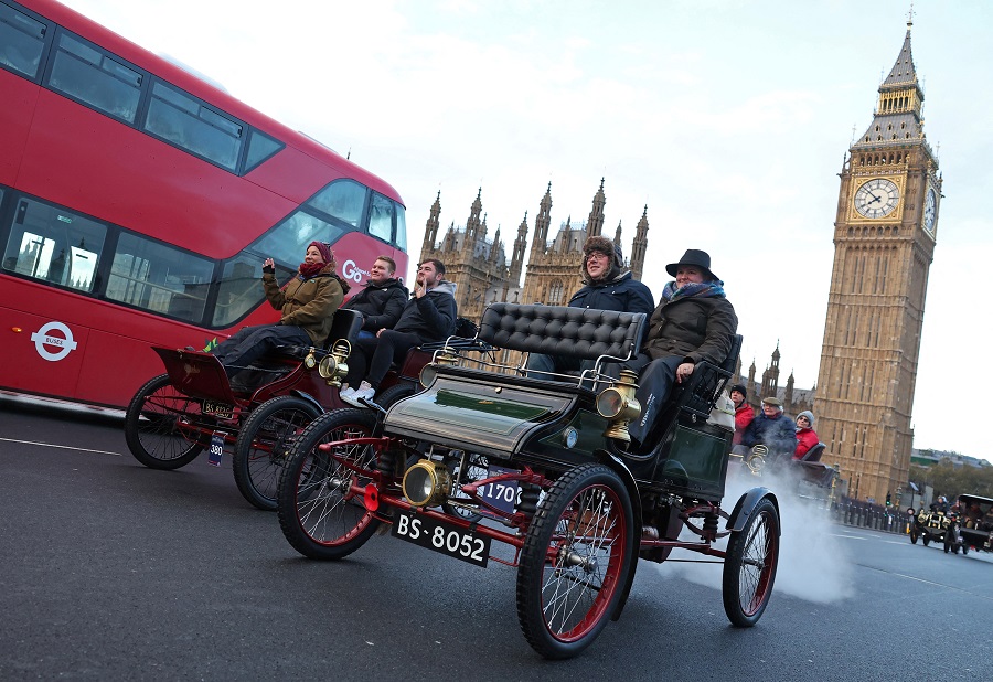 当地时间2023年11月5日,英国伦敦,在伦敦至布赖顿老爷车大赛中,参赛者驾驶1905年以前生产的汽车行驶在威斯敏斯特桥上,经过议会大厦。