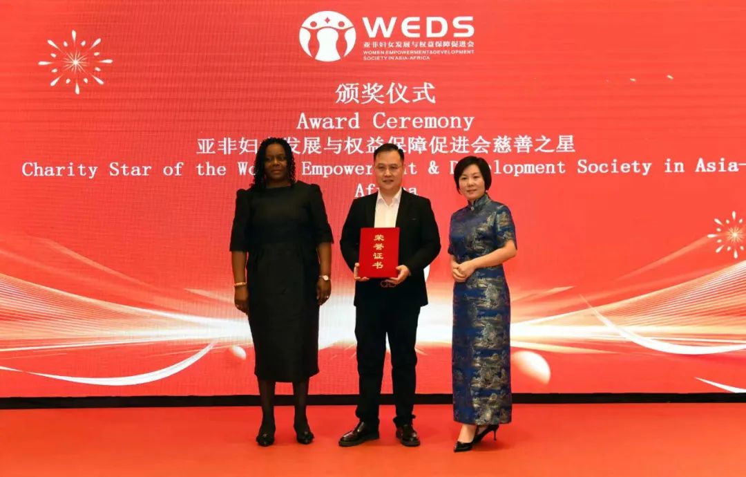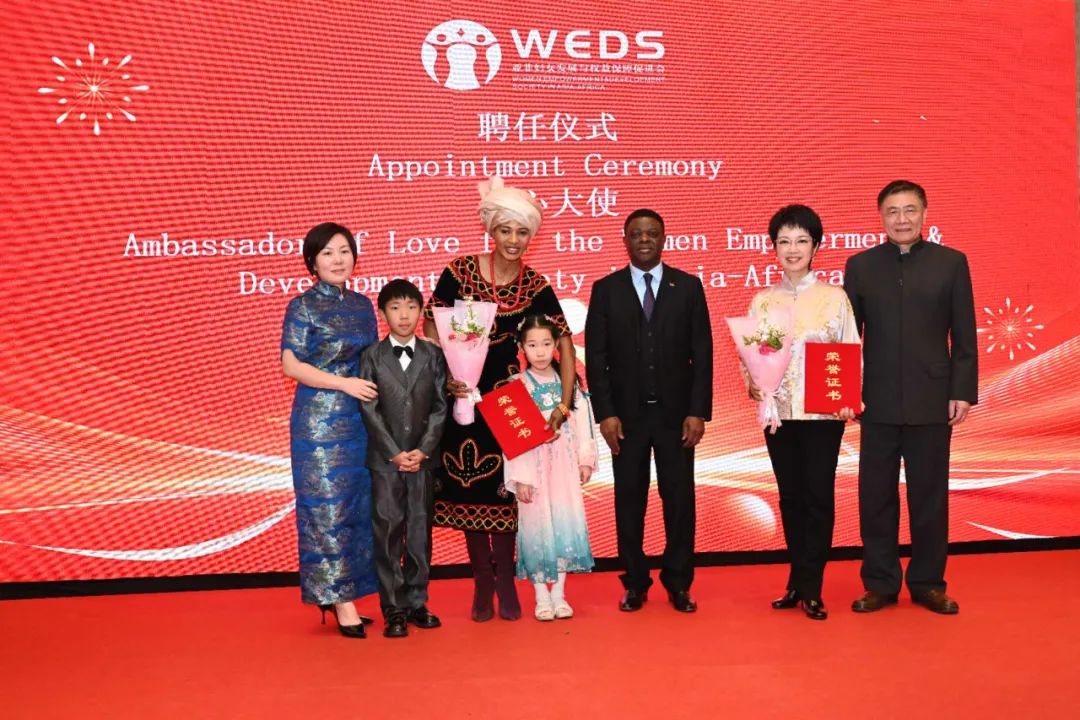 马拉维驻华大使、中国和平发展基金会徐建国秘书长、亚非妇促会会赵美玲会长向黄薇、玛丽亚颁发亚非妇促会“爱心大使”荣誉证书。