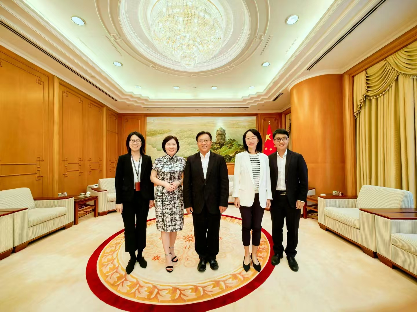 图为:(左二)赵美玲会长拜会(中间)外交部驻港公署崔建春特派员并一起合影