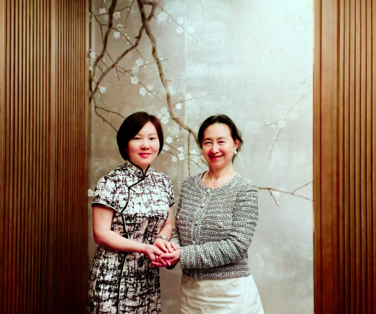 图为:(左)赵美玲会长与(右)香港妇协何超琼主席交流后合影