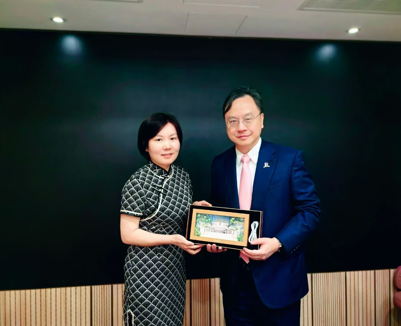 图为:(左)赵美玲会长与(右)港中大卢煜明校长交流合影