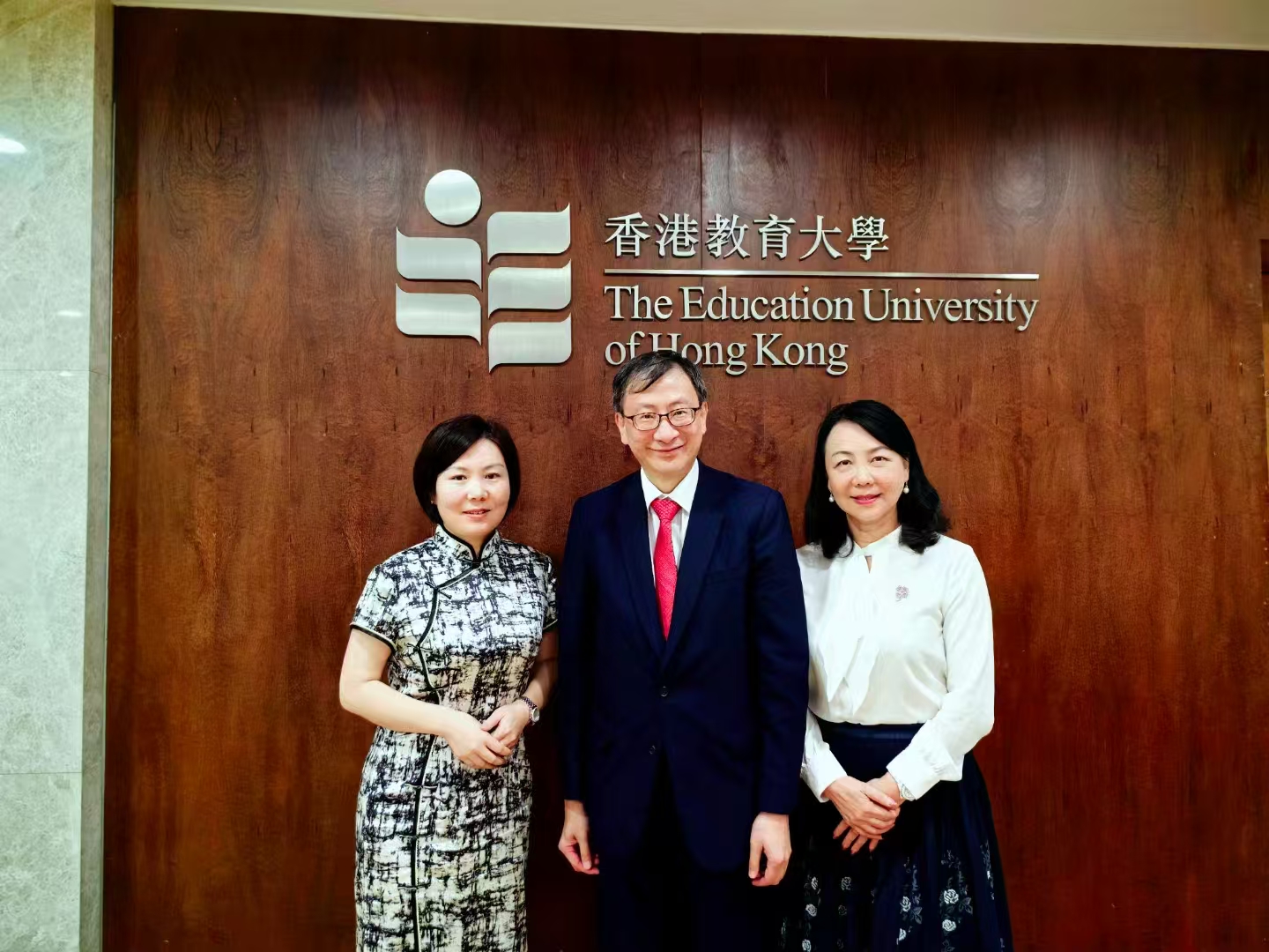 图为:(左)赵美玲会长与(中间)香港教育大学李子建校长交流后合影留念
