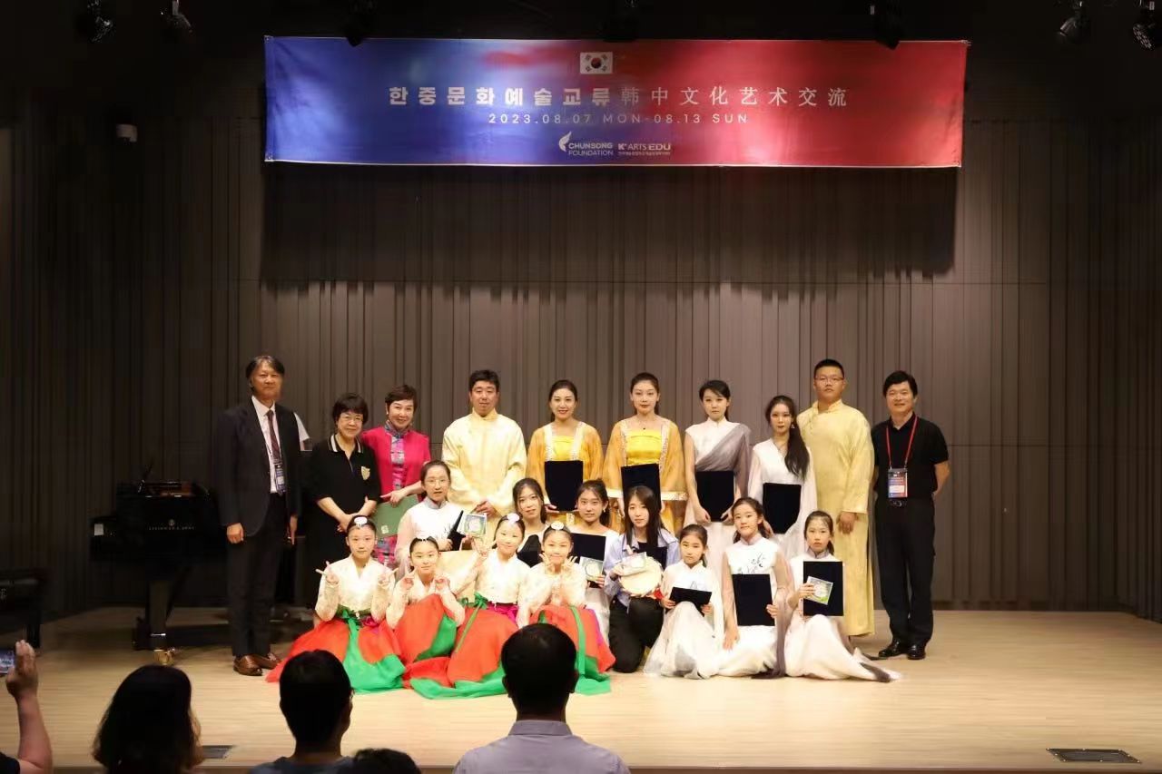 8月12日,代表团与韩国艺术综合大学部分师生在首尔中央音乐学院音乐厅举办了“韩中文化艺术交流音乐会”。中国驻韩国使馆文化参赞兼首尔中国文化中心主任沈晓刚专程前往出席音乐会。