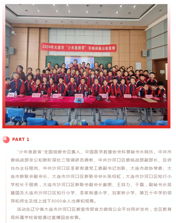 此次活动在中共大连市委统战部指导和支持下,由大连市新联会主办,中共大连市沙河口区委统战部协办,由大连市沙河口区新联会、大连金普新区保航安全志愿者服务中心承办的“少年急救官”公益直播活动在大连知行小学多功能厅隆重举行,并由大连电视台在“少年急救官”组委会视频号进行全国直播。
