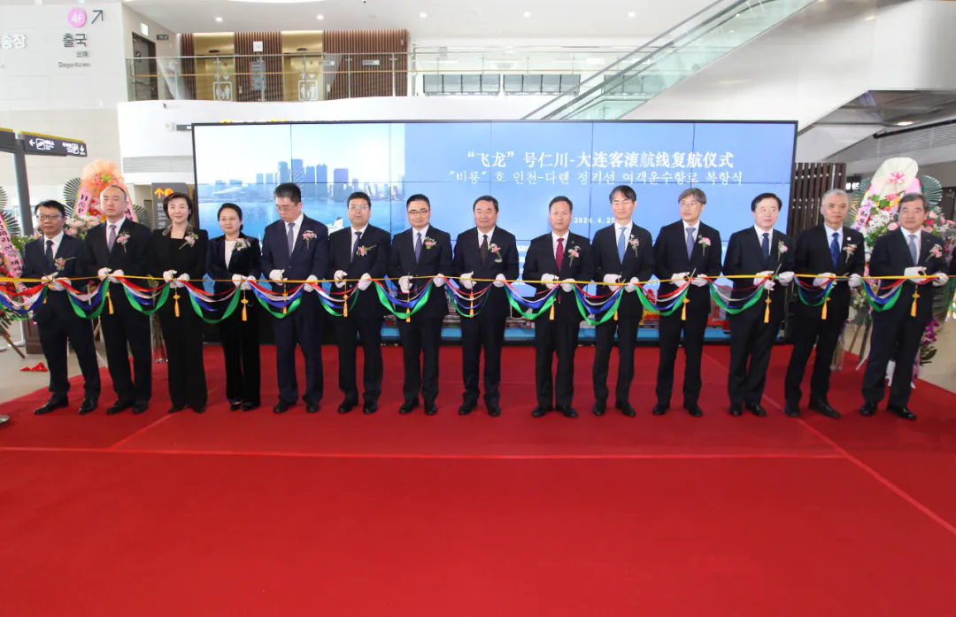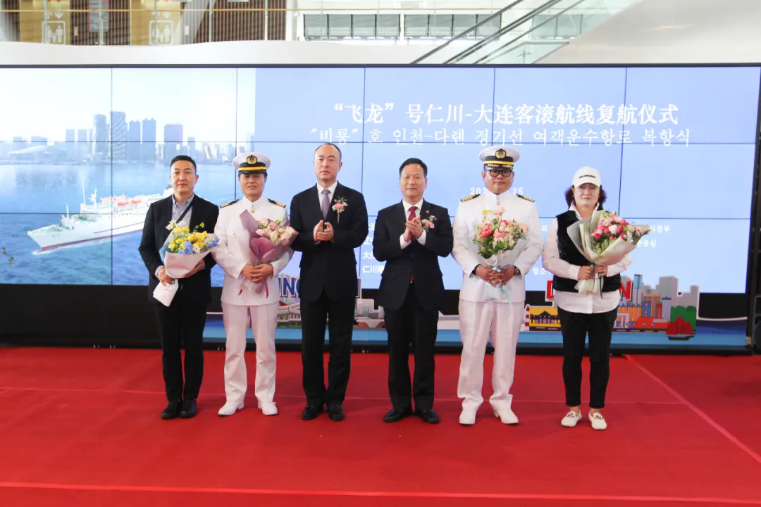 “飞龙”号轮船由韩国大仁轮渡有限公司运营,该公司由中远海运大连投资有限公司等中国企业与多家韩国企业合资组建。“飞龙”号轮船1995年开通运营,执行大连—仁川客货滚装航班,累计为中韩两地运送旅客175万余人次,集装箱43万余标箱。受疫情影响,该航班于2020年暂停客运业务。随着两地人员往来越来越密切,对客运航线的需求不断增大,经过两地相关部门积极协调配合,相继完成了项目审批、泊位改造等系列工作,客运业务实现复航。当日的活动现场气氛欢快热烈。仁川市、大连市相关负责人先后致辞,仁川市、韩国大仁轮渡相关负责人为乘客代表、“飞龙”号船长和乘务长献花。伴随着悠扬的音乐,首批乘客陆续登上轮船,当地时间15:30,轮船向着大连方向启航。