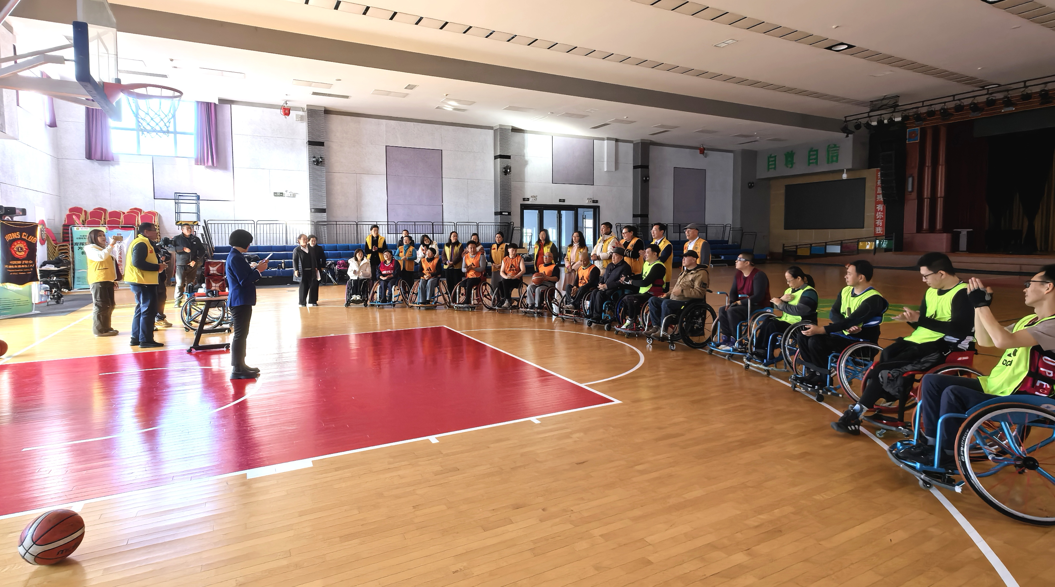 在捐赠活动现场,轮椅篮球运动员们进行了轮椅篮球表演赛,博得到了狮友们的阵阵掌声和喝彩。