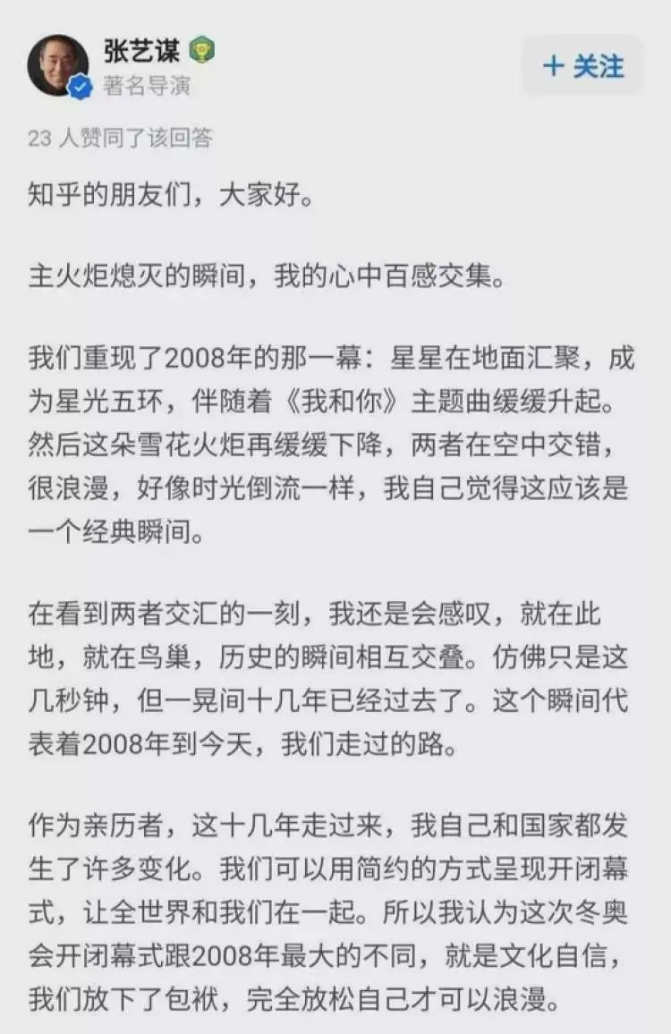 而在冬奥会闭幕仪式结束后,张艺谋特别发文,分享了与冬奥会结缘以来的心路历程。