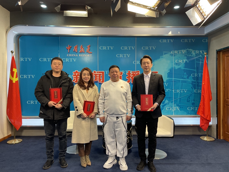 (右二)中国报道《人物访谈》主编李传军(左二)中国报道《人物访谈》副主编耿玲(右一)中国报道《人物访谈》主持人刘呈洲(左一)中国报道《人物访谈》编导王禹博
