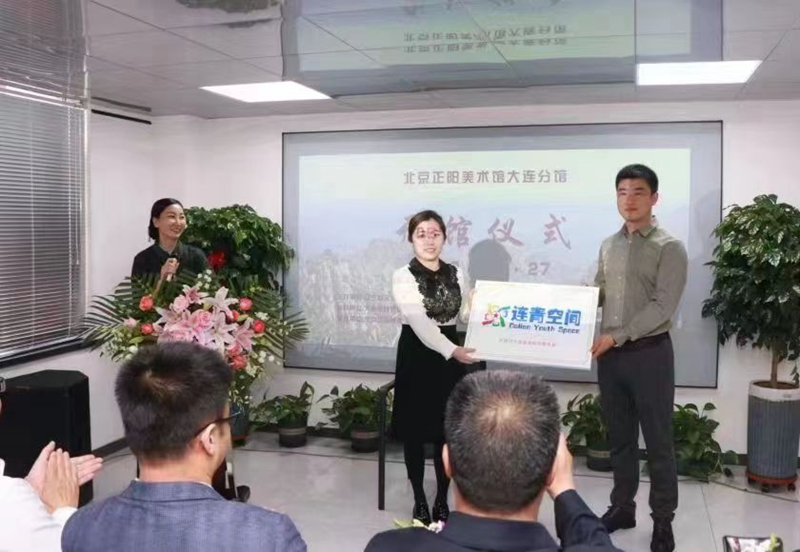 图为:金普新区共青团授给北京正阳美术馆大连分馆青年之家牌匾