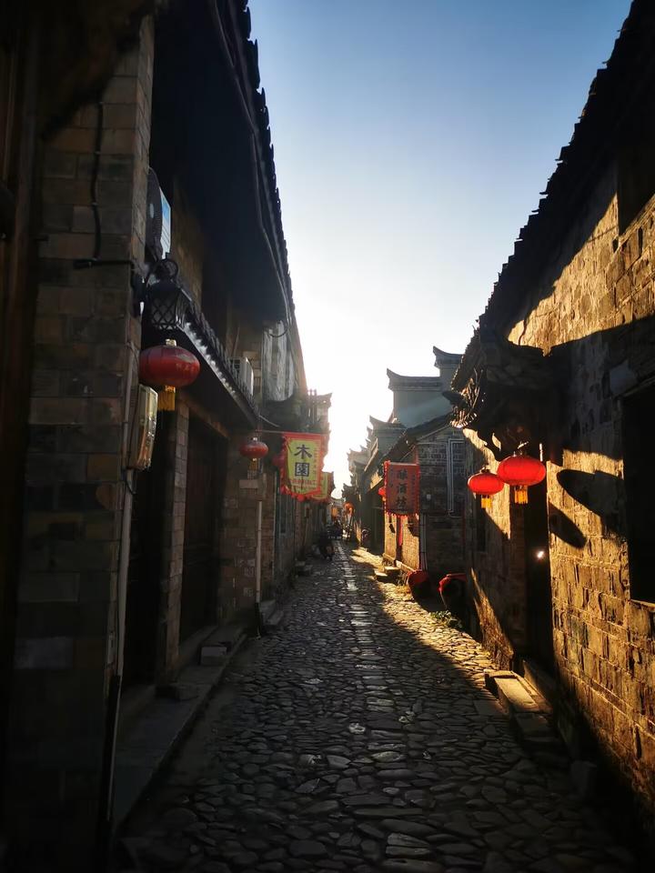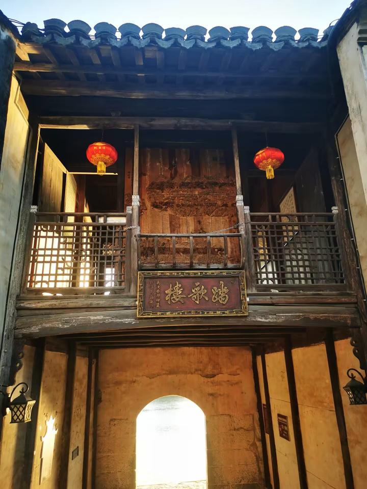 踏歌岸阁因李白《赠汪伦》诗中“忽闻岸上踏歌声”之句而得名,入阁即进南阳古镇的正街,出阁正好面对桃花潭。