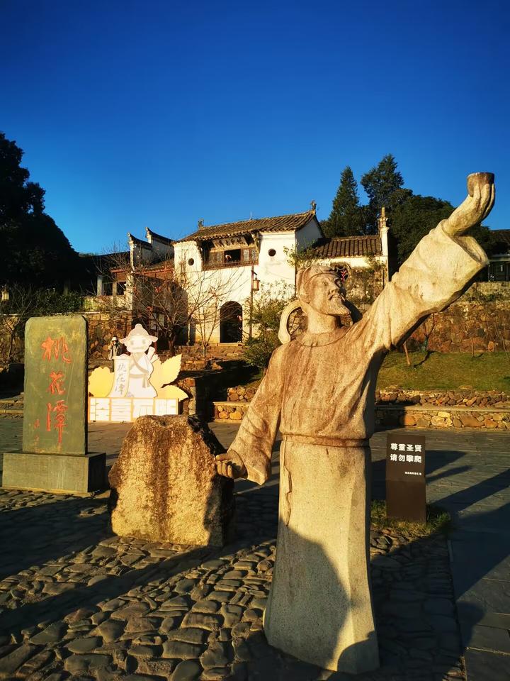 附近点缀着人文景观,曲径通幽的书板巷、李白醉卧的彩虹岗、踏歌声声的古岸阁、青砖黛瓦的古民居......县志《桃花潭记》称“层岩衍曲,回湍清深”,“清泠皎洁,烟波无际”。