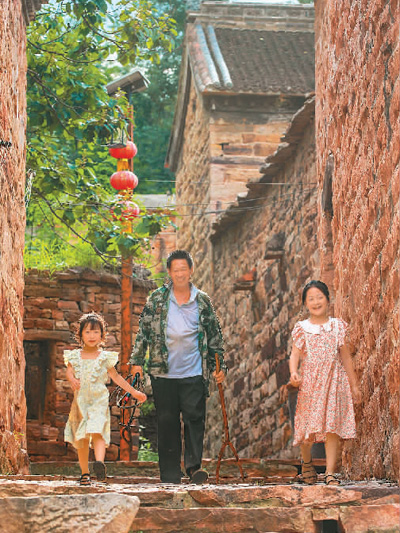 在柴关乡石门沟村,街巷地面全由红石板铺成,石板街道随地势起伏,陡坡处垒砌有石板台阶。图为村民走过石门沟村的古巷。 邵玉姿、高儒森摄