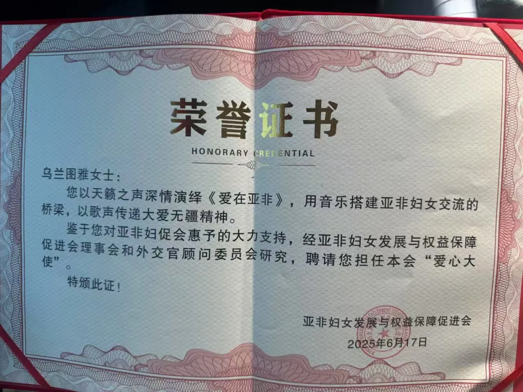 在颁奖环节,乌兰图雅获聘“爱心大使”,这不仅是一份荣誉,更是对她以艺术助力公益、促进交流的肯定。她将以新身份,持续用音乐为亚非妇女事业添彩,让艺术之美融入交流合作。