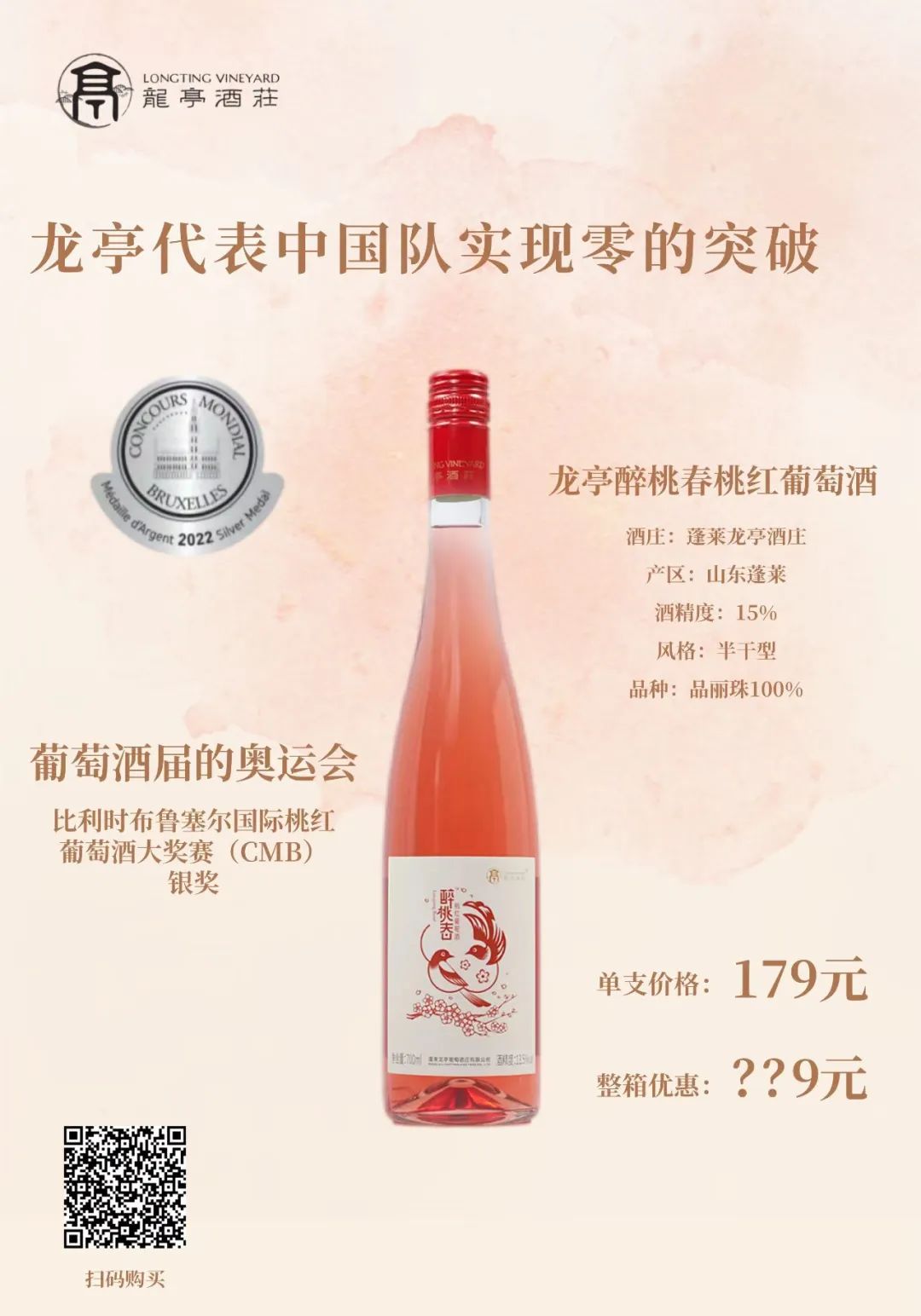 龙亭酒庄为了庆祝醉桃春桃红在2022比利时布鲁塞尔国际桃红葡萄酒大奖赛中的出色表现,推出限时低价特惠购活动,一键下单,春天就喝上这款养眼又美味的桃红。