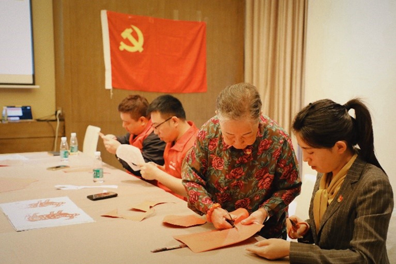 同时,自2007年起,师从国家级非物质文化遗产项目庄河剪纸代表性传承人韩月琴老师学习剪纸的85岁高龄老党员刘学斌同志,也向年轻党员讲述了这段传统艺术传承的故事,并现场教学。在严肃而喜悦的氛围中,各位党员、团员代表们共同庆祝中华传统节日端午节和中国共产党建党102周年华诞的到来。