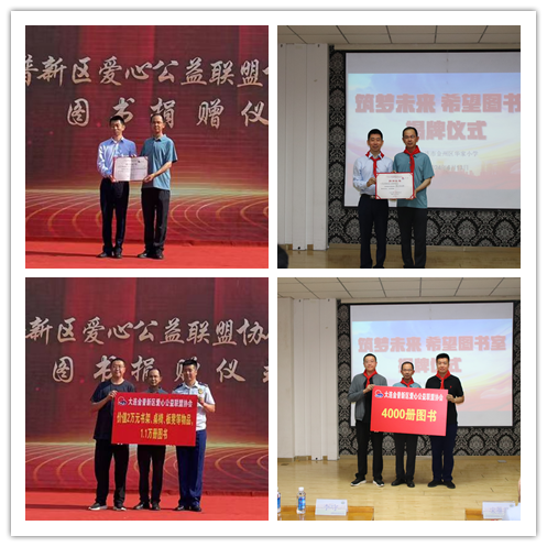 大连金普新区爱心公益联盟协会通过市青基会捐赠价值2万元的书架、桌椅、板凳等物资,以及1.5万册的图书,用于援建金普新区得胜小学和华家小学希望图书室。据介绍,大连金普新区爱心公益联盟协会自成立以来,秉承“尽己所能,服务社会,汇聚爱心,传递梦想”的宗旨,累计筹集捐赠款物1000余万元,服务群众百万余人次。先后被大连市文明办、团委、民政等部门评为:正能量之星、最佳志愿服务组织、青年志愿者行动优秀志愿服务组织、5A级慈善组织、贡献奖公益组织、示范实践队伍等称号。