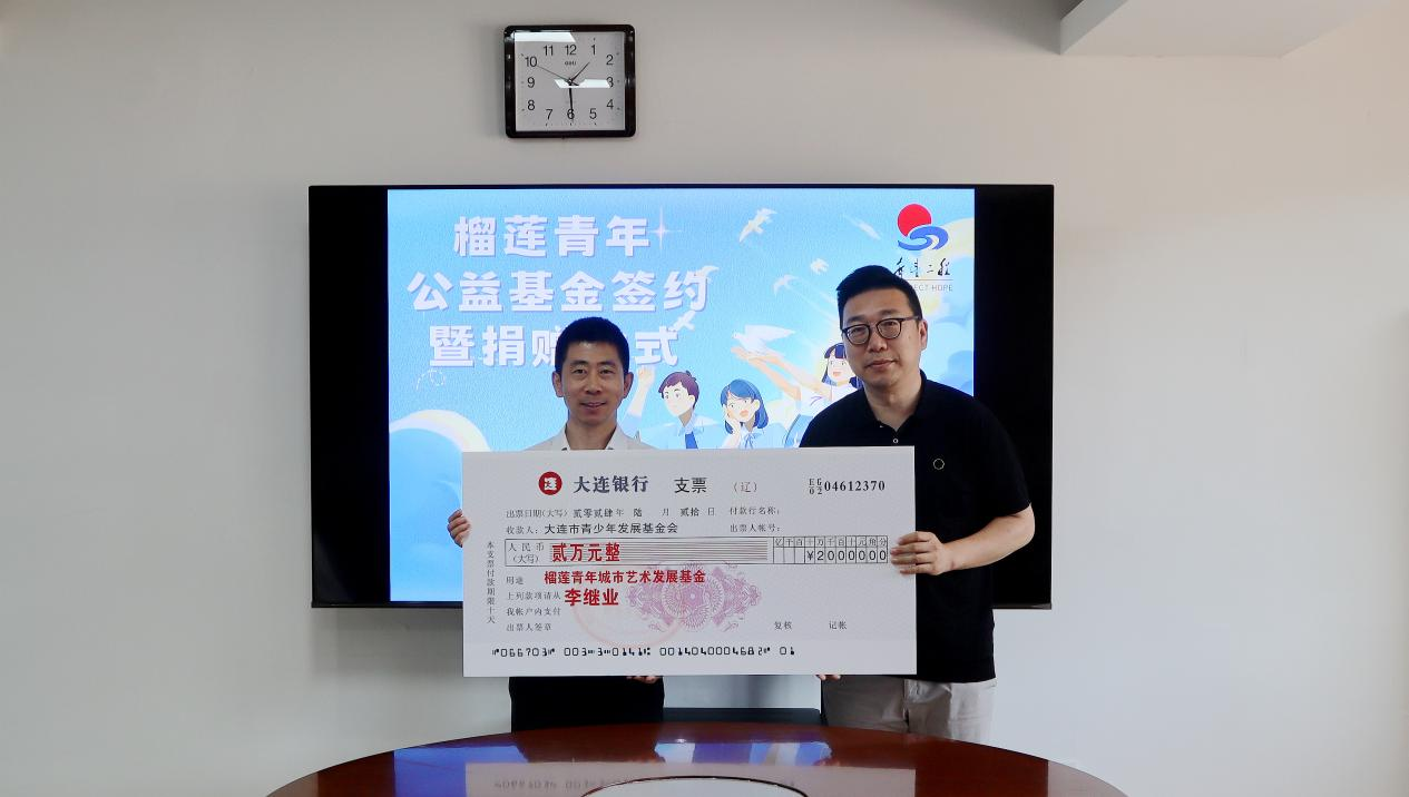 榴莲青年成员、一拍即合影业董事长、大连市青年美术家协会副主席李继业捐赠启动基金2万元,大连市青少年发展基金会理事长宋继君接受捐赠并颁发证书。李继业董事长对现代社会中艺术与城市发展的紧密关联进行了阐述,期待大连城市的艺术基因得到更多的重视,挖掘和发扬。