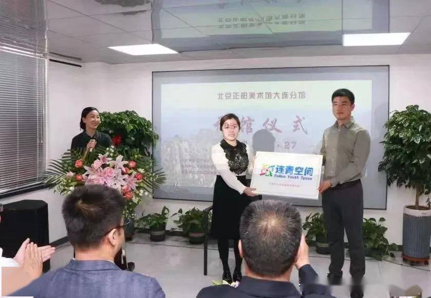 图为:金普新区共青团授给北京正阳美术馆大连分馆青年之家牌匾。